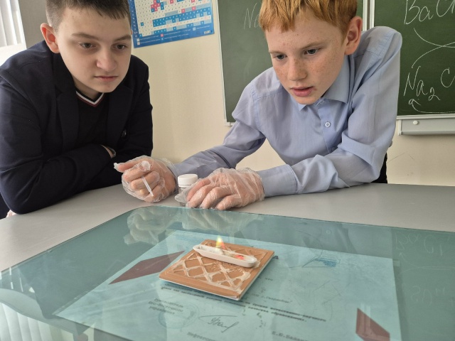 В ходе встречи Денис провел для ребят несколько химических опытов, наглядно продемонстрировав широкие возможности кабинета химии, оснащенного всем необходимым и отремонтированного в рамках Нацпроекта.